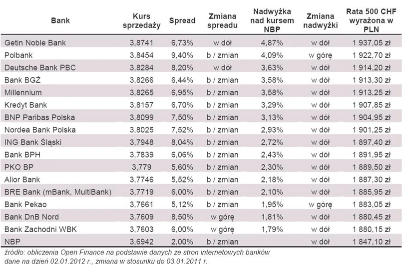 Smaczku wynikom analizy dodaje fakt, że Getin i DB PBC (banki, które z punktu widzenia klienta poprawiły kursy) nadal są w ścisłej czołówce jeśli chodzi o najmniej atrakcyjny kurs sprzedaży. Na drugim biegunie są BZ WBK, Bank DnB Nord i Bank Pekao. Z punktu widzenia osoby spłacającej kredyt najważniejsze są nie procenty, a kurs sprzedaży. Kredytów frankowych praktycznie się już nie udziela, dla banków kurs zakupu stracił znaczenie. W Getinie zastosowano więc sztuczkę polegającą na zmniejszeniu spreadu, ale przesunięciu obu kursów (zakupu i sprzedaży) w górę. Mimo spadku spreadu kursy sprzedaży tego banku nadal są najwyższe na rynku.
