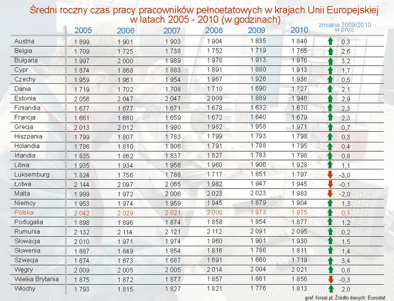 Nieznacznie wyprzedzając tylko Finlandię, Francja zajęła przedostatnie miejsce w Europie pod względem średniej ilości przepracowanych w 2010 roku godzin, wśród osób pracujących na pełny etat. Najwięcej pracowali mieszkańcy Rumunii, a Polacy zajęli piąte miejsce.