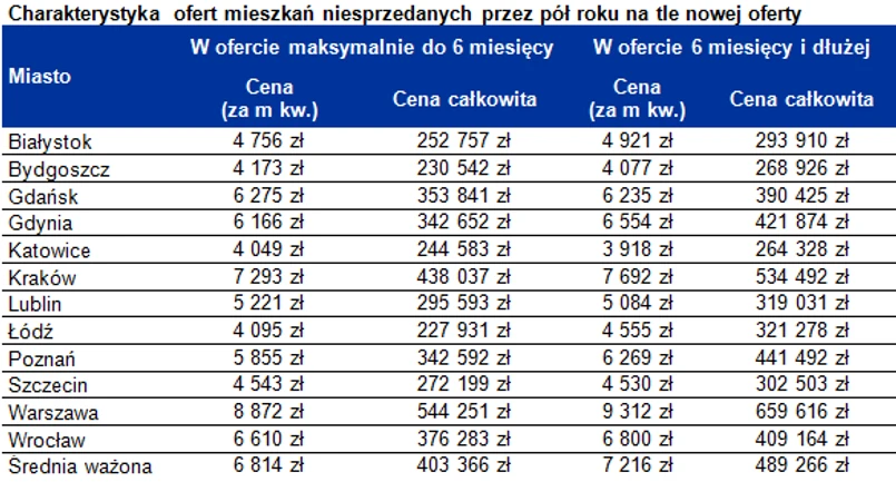 Dlaczego? Problemem jest zwykle duży metraż, który powoduje, że choć cena metra jest niższa, to całe mieszkanie jest drogie. Porównując całkowitą cenę ofertową mieszkań niesprzedanych od ponad pół roku z tymi, które do oferty trafiły później, otrzymaliśmy różnicę na poziomie 21%. W pierwszej chwili może ona zaskakiwać, ale jeśli uwzględnimy to, że porównujemy potencjalny koszt zakupu na przykład kawalerki z mieszkaniem 3-pokojowym, to taka różnica jest czymś zupełnie naturalnym. W okresie spadającej zdolności kredytowej, mieszkania duże i drogie są szczególnie trudno zbywalne.