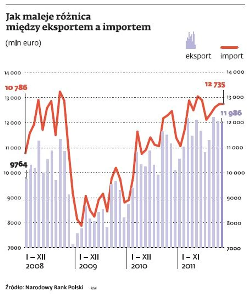 Maleje różnica pomiędzy eksportem a importem. W listopadzie 2011 r. przywieźliśmy do Polski towary o wartości 12,7 mld euro, to o 2,3 proc. więcej niż przed rokiem. W tym czasie wysłaliśmy za granicę produkty za niemal 12 mld euro – o 7,3 proc. więcej. Ujemne saldo obrotów towarowych wyniosło 749 mln euro i w porównaniu z listopadem 2010 r. poprawiło się o 531 mln euro – podał NBP.
