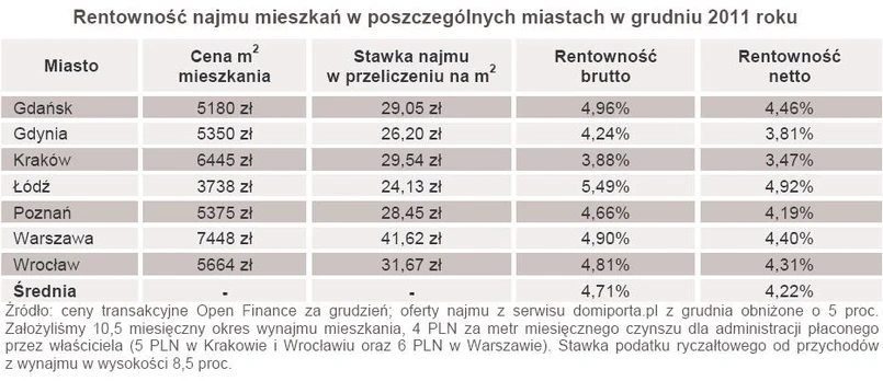 Osoby, które przed rokiem zainwestowały w mieszkanie na wynajem nie mają specjalnych powodów do zadowolenia. Średni realny zwrot z tytułu takiej inwestycji w 2011 roku wyniósł minus 5,5 proc., co prześledziliśmy na podstawie transakcji dokonywanych przez klientów Open Finance oraz ofert wynajmu zamieszczanych w serwisie Domiporta.pl.