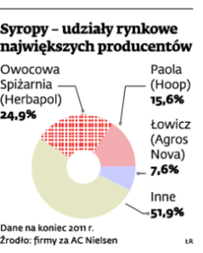 Na tym rynku rządzą trzy firmy, do których należy niemal 50 proc. sprzedaży. Liderem jest Herbapol Lublin, właściciel marki Owocowa Spiżarnia. Należy do niej niemal co czwarty sprzedany na rynku syrop. Za nią, z 15,6-proc. udziałami, plasuje się marka Paola należąca do Hoop Polska, a dalej Łowicz (Agros Nova) z 7,6 proc.