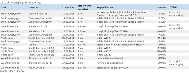 Stratą dla inwestorów zakończyło się w 2011 r. 46 produktów, czyli 10,18 proc. Zwrot kapitału nastąpił w przypadku 175 struktur, czyli 38,72 proc. Spośród struktur, które przyniosły zysk, tylko 62 (13,72 proc. wszystkich) dały zarobić w skali roku więcej niż 10 proc. Stopą zwrotu powyżej 15 proc. może się pochwalić 21 produktów (mniej niż 5 proc.). Zysk przekraczający 5 proc. osiągnęło 25 proc., mniej niż w 2010 r., kiedy było to 27 proc. Biorąc pod uwagę to, że w ostatnich dwóch latach można było bez trudu na rynku znaleźć lokaty bankowe z oprocentowaniem przekraczającym 5 proc., inwestycja w struktury nie była najlepszym interesem.