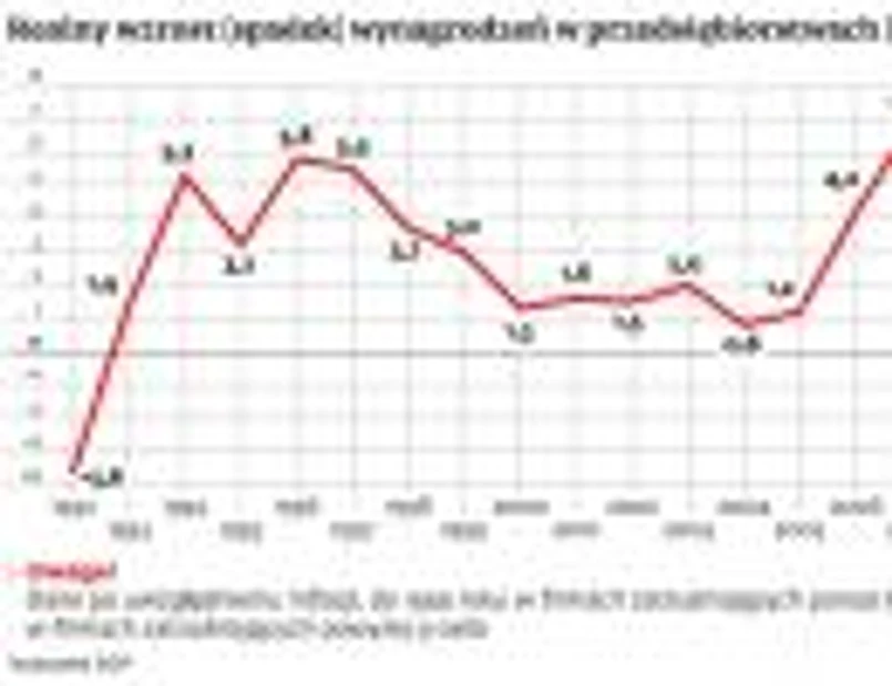 Paradoksalnie w ubiegłych latach, gdy koniunktura była dla nich mniej łaskawa, podnosiły pensje pracownikom znacznie chętniej. Tak było np. w latach 2001 – 2002, gdy roczny wzrost PKB obniżył się do 1,1 – 1,4 proc., a bez pracy było aż 3,2 mln Polaków – wtedy realny wzrost płac był dwukrotnie większy niż w ubiegłym roku i wyniósł 1,5 – 1,6 proc.