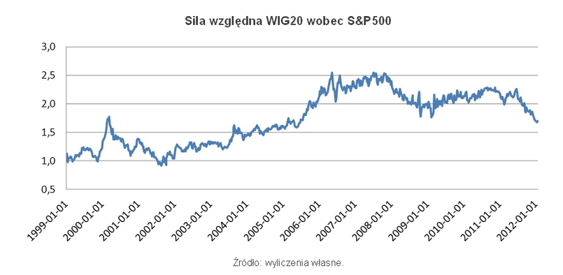Interpretacja wyników takiego porównania nie nastręcza problemów. Wzrost wskaźnika siły względnej oznacza, że WIG20 zachowuje się lepiej niż S&P500, czyli rośnie szybciej lub spada wolniej niż jego amerykański konkurent.