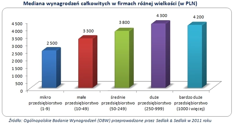Najgorzej zarabia się w przedsiębiorstwach zatrudniających mniej niż 9 osób - mediana miesięcznych całkowitych wynagrodzeń wynosi tu jedynie 2,5 tys. zł. Małe firmy, w których pracuje od 10-49 osób oferują zatrudnionym ok. 3,3 tys. zł, a średnie (od 50-149 osób) – 3,8 tys. zł.