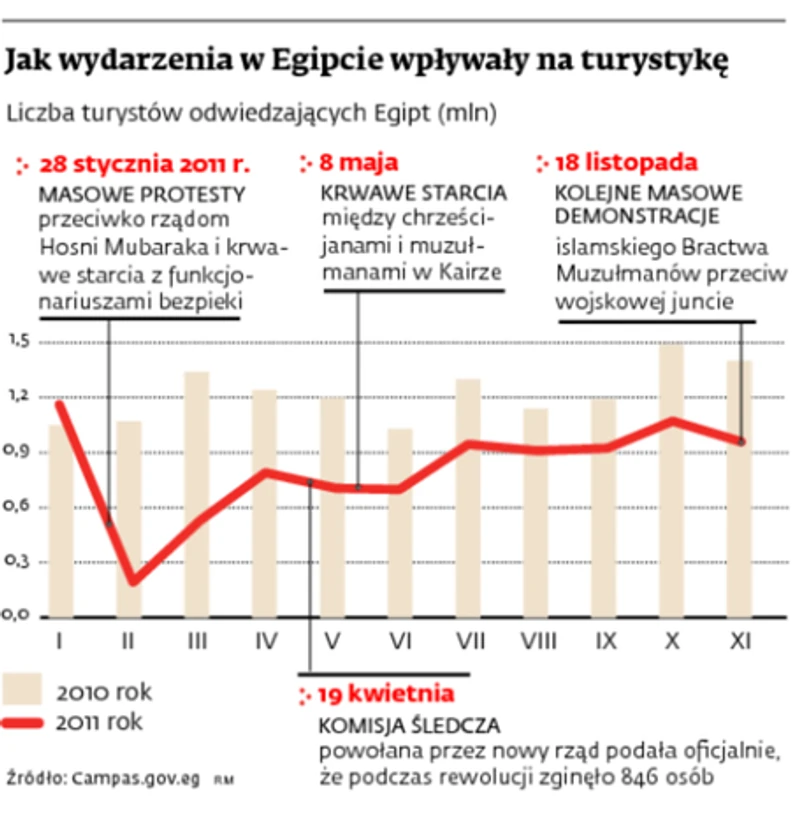 Na kairskim placu Tahrir do dziś protestują rozczarowani brakiem reform Egipcjanie. Nowa władza oskarżana jest o autorytaryzm i bezczynność. Szacuje się, że te niepokoje zmniejszyły ubiegłoroczne wpływy do egipskiego budżetu z turystyki o 33 proc. – do 8,8 mld dol.
