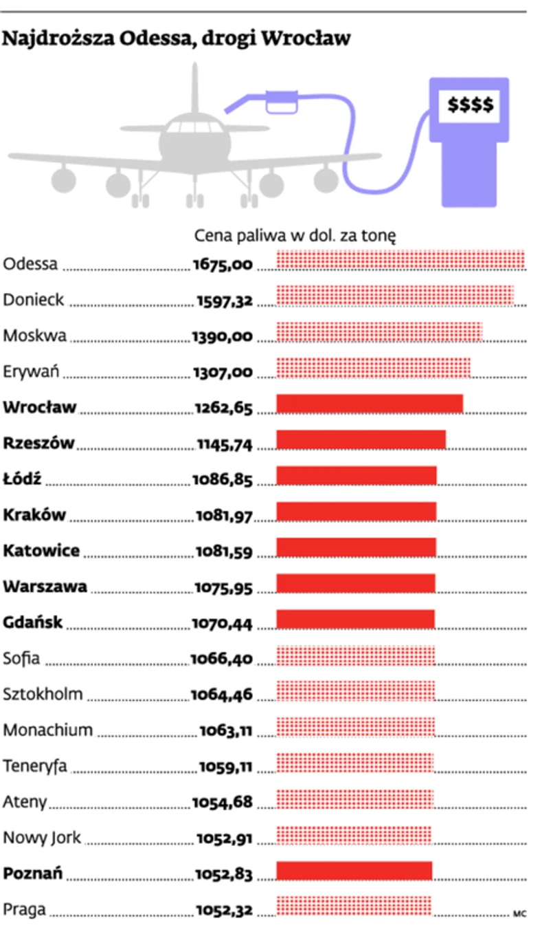 Rekordowo drogi jest Wrocław, w którym nasza narodowa linia musi płacić aż 1262,65 dol. za tonę paliwa – o ponad 200 dol. więcej niż we Frankfurcie czy w Londynie. W tym przypadku na locie z Wrocławia do Monachium oszczędności LOT-u czy Lufthansy sięgają więc nawet 300 dol.
