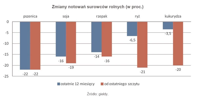 Na rynkach towarowych sytuacja również jest zróżnicowana. Choć w przypadku większości surowców, za wyjątkiem ropy naftowej, wołowiny i soku pomarańczowego, mamy do czynienia z wyraźną tendencją spadkową, to powody jej występowania w konkretnych przypadkach są odmienne. W przypadku miedzi kilkunastoprocentowe tąpnięcie można wiązać z pogorszeniem sytuacji i perspektyw globalnej gospodarki, a w szczególności z możliwością twardego lądowania Chin. Przyczyny spadku leżą więc po stronie popytu. Surowce rolne są jednak mniej zależne od wahań koniunktury gospodarczej. Ich spożycie w gospodarkach rozwiniętych jest bardzo stabilne. Z kolei w krajach najszybciej się rozwijających spowolnienie gospodarcze jest znacznie mniej dostrzegalne, a tym bardziej nie jest w stanie powstrzymać zwiększającej się systematycznie konsumpcji. W tym segmencie mamy więc do czynienia z wpływem czynników podażowych. I z najlepszym przykładem mechanizmu, według którego każda hossa niesie ze sobą zaczątek odwrócenia tendencji.