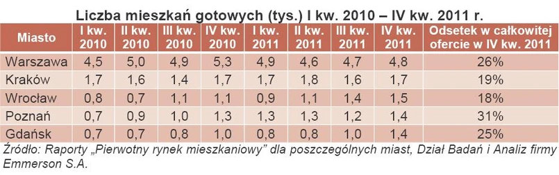 Największą część oferty gotowe lokale mieszkalne stanowią na rynku pierwotnym w Poznaniu, z kolei najmniejszą we Wrocławiu. W stolicy średnio, co czwarte nowe mieszkanie zostało już ukończone. Należy zaznaczyć, że liczba gotowych lokali mieszkalnych znajdujących się w sprzedaży, może dużo powiedzieć o rozwoju wypadków na danym rynku mieszkaniowym. Wynika to z faktu, że gdy sytuacja zmierza w dobrym kierunku deweloperom udaje się znaleźć kupców na mieszkania, jeszcze przed ostatecznym ukończeniem inwestycji. Z drugiej strony duża liczba dostępnych ukończonych mieszkań, może świadczyć o problemach firm z branży ze znalezieniem chętnych na nowe jednostki mieszkalne.