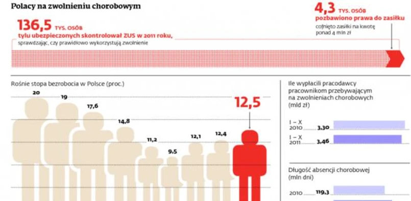 W przypadku kontroli prawidłowości orzekania o zwolnieniu wydano 38,2 tys. decyzji wstrzymujących dalszą wypłatę zasiłku chorobowego. Z kolei po skontrolowaniu 136 tys. chorych, czy prawidłowo wykorzystują zwolnienia, pozbawiono prawa do zasiłku ponad 4 tys. osób. Było to równoznaczne z cofnięciem wypłaty świadczeń chorobowych na łączną kwotę 4,2 mln zł. Te wzmożone działania kontrolne jednak nie przekładają się na mniejszą liczbę zachorowań.