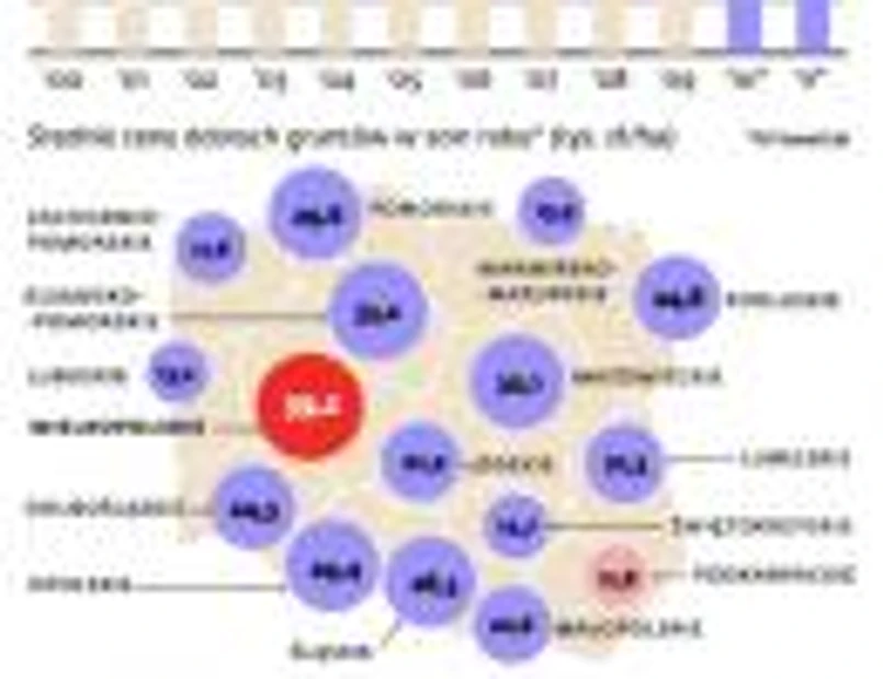 Ale to nie wszystko. – Ceny ziemi rosną, ponieważ poprawia się kondycja finansowa gospodarstw – ocenia Dariusz Winek, główny ekonomista BGŻ. Przybywa więc rolników, których stać na to, aby za ziemię płacić coraz więcej. Potwierdzają to dane Eurostatu. Według nich w 2010 roku dochody polskich rolników były o 45 proc. wyższe niż w 2005 r. W ubiegłym roku także się zwiększały. Sprzyjały temu rosnące ceny produktów rolnych. Na przykład ceny zbóż były w skupie o 47 proc. wyższe niż w roku poprzednim, bydła o 21 proc., drobiu o 18,4 proc. i trzody chlewnej o ponad 16 proc.