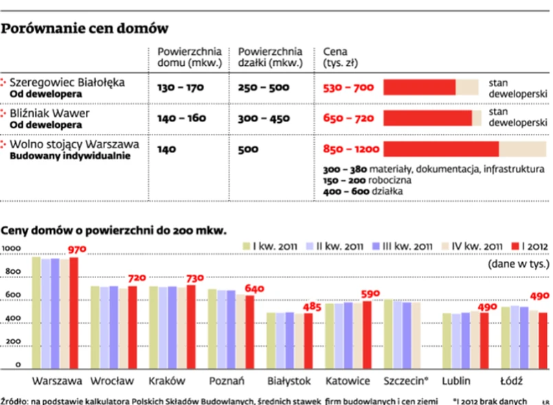 Pół bliźniaka z 300-metrową działką 20 minut od centrum Warszawy za 650 tys. zł czy szeregowiec za 530 tys. zł na Białołęce? W serwisach internetowych i prasie coraz więcej jest ofert domów, które można kupić już za 500 – 700 tys. zł. Jeszcze dwa lata temu inwestorzy chcieli za nie 50 – 100 tys. zł więcej, choć ich powierzchnia z reguły nie przekracza 150 mkw., a ogródki są niewiele większe niż chustki do nosa. To właśnie na takie niewielkie i tanie w eksploatacji domy jest dziś największy popyt. Deweloperzy oferują je nawet o kilkaset tysięcy złotych taniej, niż kosztuje budowa podobnego domu w systemie gospodarczym.