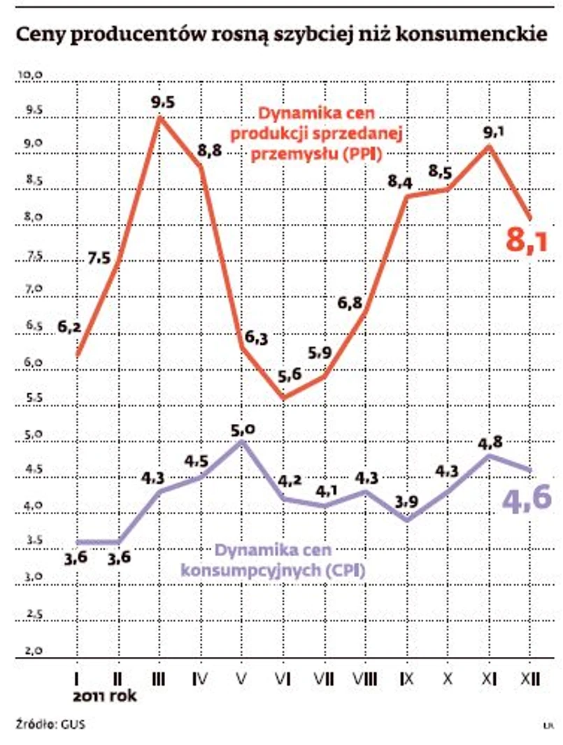 – O ile w pierwszych trzech miesiącach ich wzrost będzie umiarkowany, w granicach 3,9 – 3,5 proc. r./r., o tyle w czerwcu – lipcu mogą one skokowo wzrosnąć ze względu na Euro 2012 – mówi Tomasz Kaczor. Według prognoz Pekao i PKO BP inflacja w styczniu spadła do 4,2 – 4,3 proc. z 4,6 proc. w grudniu. Zadziałał efekt tzw. wysokiej bazy: w styczniu 2011 roku zdrożała większość towarów i usług przez podwyżkę VAT. Ale nawet efekt statystyczny by nie pomógł, gdyby nie słabnący popyt w gospodarce. To główny powód, dla którego firmy wstrzymują się z przenoszeniem na odbiorców wysokich kosztów produkcji. Jak są one wysokie, widać po cenach produkcji sprzedanej przemysłu. W grudniu wzrosły one o 8,1 proc.