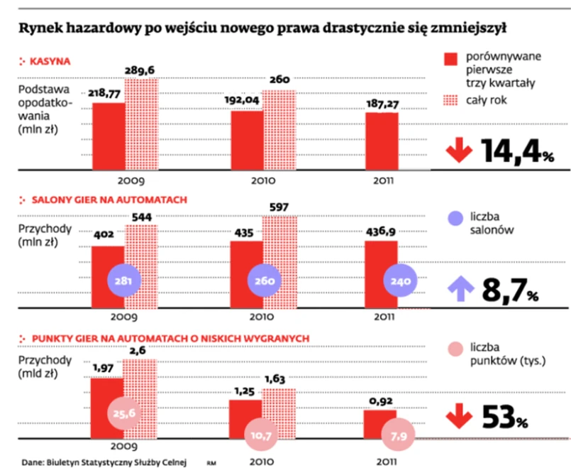 Decyzje organów UE mogą mieć wpływ na całą branżę, a ta w większości na nowej ustawie straciła. Na przewidywanej przez nowe prawo delegalizacji automatów do 2015 r. mieli zyskać właściciele kasyn. Na razie ich przychody spadają – średnio o 15 proc. To po części efekt zaostrzenia kursu wobec turniejów pokerowych: gra ta też została uznana za losową. W lepszej sytuacji są salony gry z automatami o wysokich wygranych – ich przychody lekko (8 proc.) wzrosły i w 2011 r. sięgnęły 470 mln zł, ale za to zmniejszyła się liczba samych salonów i to o jedną piątą, co także było celem nowelizacji.Resort finansów mniej jednak chyba jest zadowolony ze spadku wpływów z opodatkowania hazardu. W latach 2010 i 2009 roku było to po 1 mld 580 mln złotych, a po pierwszych trzech kwartałach 2011 roku zaledwie 1 mld 94 mln złotych. W tym roku wpływy mają być o kolejne 100 mln złotych mniejsze.