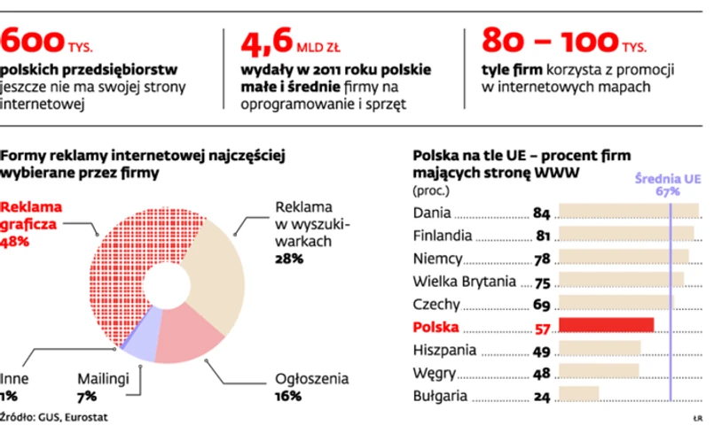 Blisko 600 tys. firm – najczęściej małych i średnich – wciąż praktycznie w ogóle nie korzysta z internetu. Z danych TNS OBOP wynika nawet, że ponad połowa firm wciąż nie posiada strony internetowej czy nawet internetowej wizytówki. A dane zebrane przez Google mówią, że w przypadku firm zatrudniających do 3 osób, aż 46 proc. nie planuje założenia strony w internecie. Główne podawane powody nieposiadania strony internetowej to opinia, że „moja firma nie potrzebuje strony WWW” bądź przeświadczenie, że „nie będzie to w ogóle miało pozytywnego wpływu na działalność mojej firmy”. To błąd. Dla małych i średnich przedsiębiorstw, nieposiadających dużych budżetów promocyjnych, brak obecności w sieci odbiera jedyną i względnie tanią okazję, by zdobyć nowych klientów i zwiększyć sprzedaż.