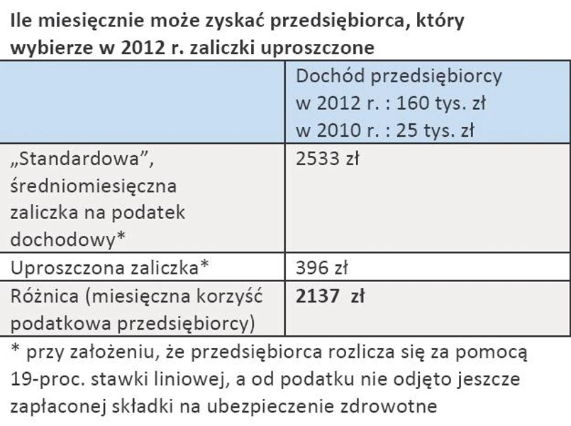 Inna sytuacja byłaby, gdyby naszemu przykładowemu przedsiębiorcy powinęła się z powodu kryzysu noga i firma w 2012 r. zamiast wysokiego dochodu przyniosła stratę. Choć biznes nie byłby dochodowy, podatek i tak musiałby być co miesiąc zapłacony – przedsiębiorcy, którzy zdecydują się na uproszczone zaliczki, muszą bowiem stosować taką formę przez cały rok podatkowy, niezależnie od swoich zarobków. W ten sposób odwróciłyby się role – „kredytobiorcą” z pożyczką na preferencyjnych warunkach byłby fiskus, a nie przedsiębiorca.