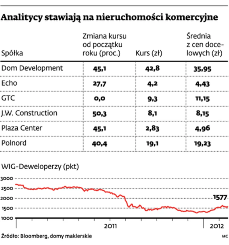 Deweloperzy mieszkaniowi na tle komercyjnych odpowiedników wypadają blado. Po ostatnich zwyżkach kursu Dom Development zdecydowanie przebił średnią z cen docelowych – 35,95 zł. Trigon DM zalecił kupno firmy i wyznaczył cenę docelową na 45 zł. Pozostali analitycy są mniej optymistyczni, ich ceny docelowe wynoszą od 30 zł do 39,1 zł.