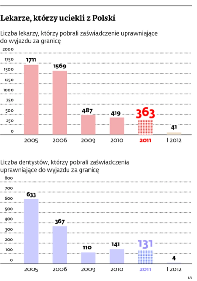Ruch zrobił się jedynie w wyjazdach do Niemiec: na stronach Naczelnej Izby Lekarskiej wśród ostatnich ogłoszeń dotyczących wyjazdów za granicę królują te zachęcające do wyjazdów do naszych zachodnich sąsiadów. To efekt otwarcia w maju 2011 r. tamtejszego rynku pracy. Firmy pośredniczące oferują pomoc w znalezieniu mieszkania, dobre zarobki, kursy językowe. Za zwerbowanie lekarzy płacą im szpitale – Polacy nie muszą nic wydawać.