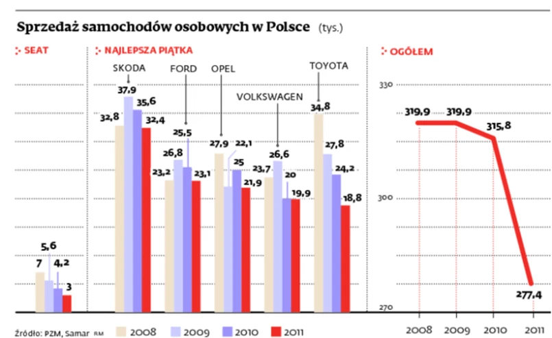 W 2011 r. importer Seata na Polskę sprzedał u nas 3 tys. aut. Tymczasem w poprzednich latach sprzedawał od dwóch do pięciu tysięcy więcej pojazdów. Ale w obecnej sytuacji takie wymagania są niemożliwe do spełnienia bez pieniędzy na promocje. Importer jest w stanie zaoferować co najwyżej kilkuprocentowy upust cenowy. A konkurenci proponują nawet kilkudziesięcioprocentowe rabaty. W efekcie promocja w salonach Seata może skusić tylko najwierniejszych fanów tej marki.