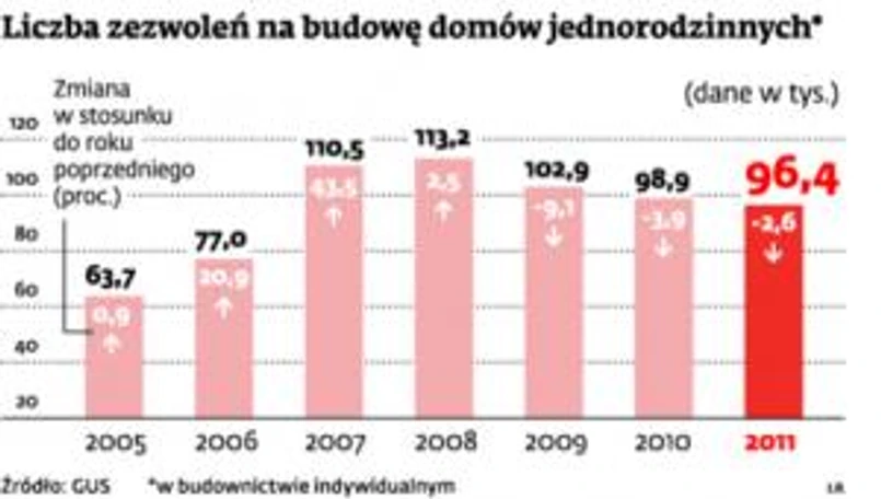 Tylko 96,4 tys. zezwoleń na budowę domów jednorodzinnych wydano w ubiegłym roku w całej Polsce, gdy jeszcze cztery lata temu ponad 113 tys. i notowano szybki wzrost. Np. w 2007 roku wyniósł 40 proc.