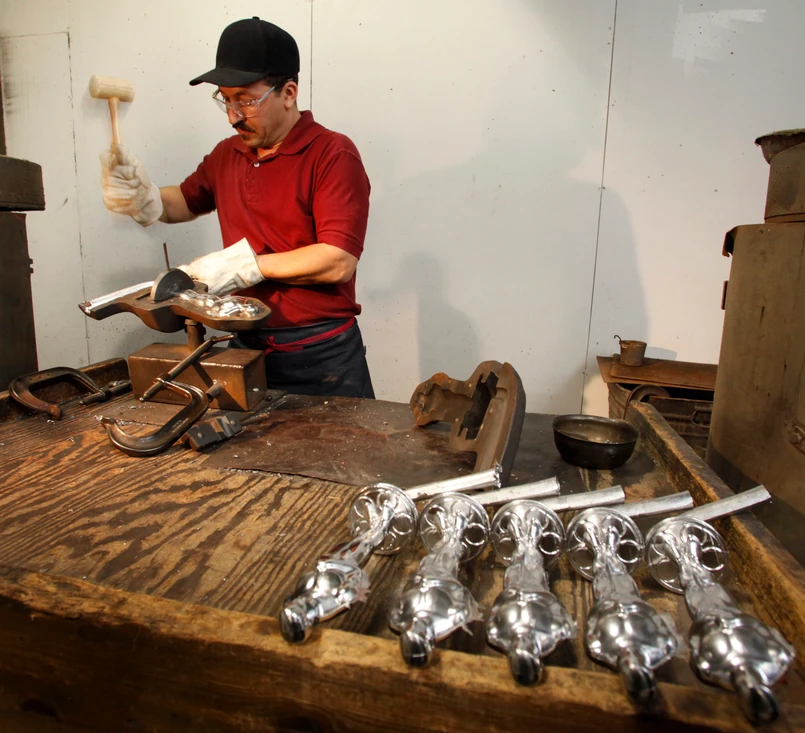 A.R. To klasyczny odlew w stalowej formie. Wyżłobiony w stali wycyzelowany negatyw najpierw się ogrzewa, a potem w tę gorącą formę wlewa się tzw. "britannium", czyli stop cyny (93 proc.), antymonu (5 proc.) i miedzi (2 proc.). Potem figurki są cyzelowane, a na koniec złocone 24 karatowym złotem.