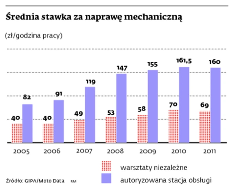 Według Frankego przechodzenie do niezależnych warsztatów podyktowane jest głównie ceną. W warsztatach niepowiązanych z koncernami motoryzacyjnymi przeglądy są tańsze nawet o 40 proc. Znacznie tańsze niż w ASO są płyny czy filtry wymieniane przy okazji przeglądów okresowych. Tańsza jest też praca. Z zestawienia GiPA i Moto Data wynika, że obecnie za godzinę pracy mechanika w ASO trzeba zapłacić 160 zł, podczas gdy w niezależnym warsztacie dwa razy mniej. W efekcie w przypadku droższych samochodów przy usłudze wartej w autoryzowanym serwisie 2 tys. zł po wizycie u tańszej konkurencji w portfelu kierowcy pozostaje więc często nawet 1000 zł.