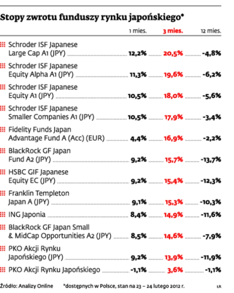 Polscy inwestorzy mają możliwość nie tylko grania na jenie, lecz także inwestowania w akcje japońskich firm. Mogą to zrobić za pośrednictwem krajowych i zagranicznych funduszy inwestycyjnych mających ekspozycję na Japonię. Dynamiczne wzrosty indeksu Nikkei225 z ostatnich tygodni najlepiej potrafiły wykorzystać fundusze Schroder’s. Wśród polskich najlepszy był ING Japonia. Jednak o ile co do kierunku, w jakim pójdzie jen, panuje zgoda, o tyle analitycy nie są pewni, jak zachowa się rynek akcji Kraju Kwitnącej Wiśni.