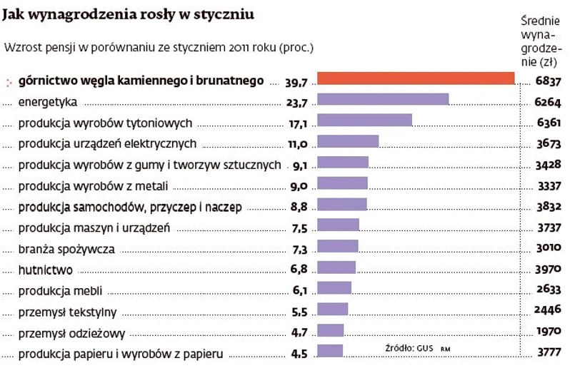 Styczeń przyniósł pracownikom wielu firm deszcz pieniędzy. Np. w górnictwie węgla kamiennego i brunatnego średnie płace były aż o 39,7 proc. wyższe niż przed rokiem i przekroczyły 6,8 tys. zł – wynika z danych GUS. Duży wzrost wynagrodzeń w styczniu, w porównaniu z tym samym okresem 2011 r., nie był jednak przypadkowy.