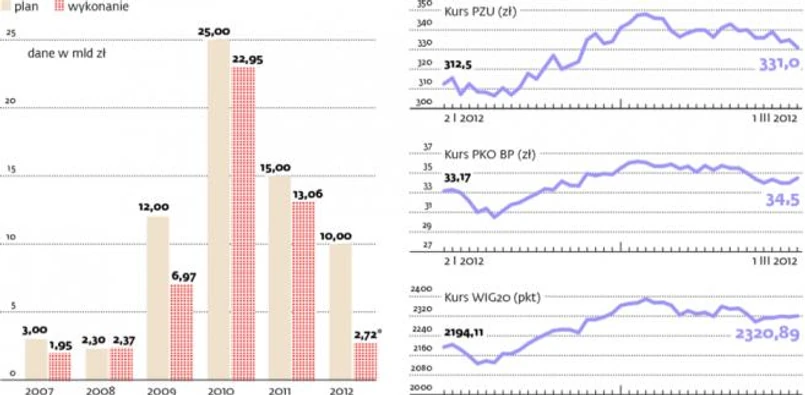 Wybór odpowiedniego momentu przeprowadzenia ofert to chyba największy ból, jaki będzie miał w tym roku resort skarbu. W teorii powinno być łatwo: Europejski Bank Centralny pożyczył właśnie ośmiuset instytucjom finansowym prawie 530 mld euro. Jeśli powtórzy się sytuacja ze stycznia, kiedy to po pierwszej transzy pożyczki EBC (prawie 490 mld euro) rozpoczął się marsz w górę indeksu WIG20 (w sumie zyskał on od początku roku około 7 proc.), to resort skarbu mógłby już przygotowywać ofertę.