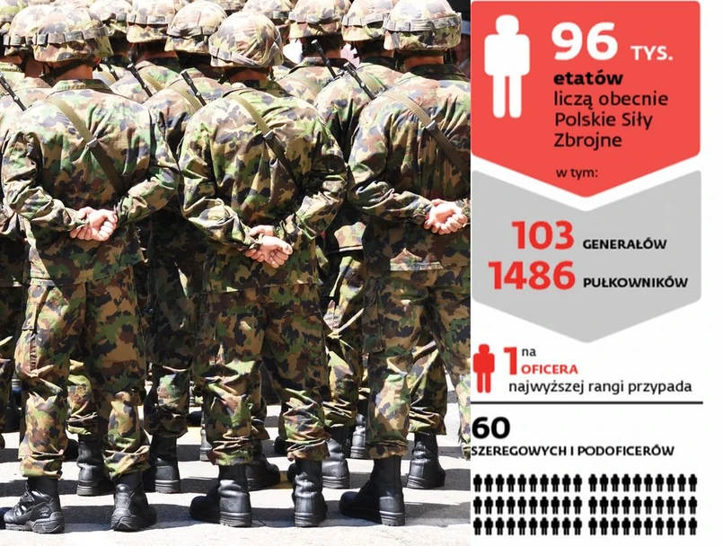 Nigdy w dziejach polska armia nie była tak mała: liczy niespełna 96 tys. etatów, a tylko w minionym roku uciekło z niej 7,4 tys. żołnierzy. Odchodzą coraz młodsi mundurowi, bo średnia wysługa zmniejszyła się z 21 do 16 lat. Niezmienna pozostaje za to liczba generałów i pułkowników, których służy niemal 1600. W przeliczeniu: jeden generał mógłby dowodzić batalionem, a jeden pułkownik przypada na 1/3 kompanii.