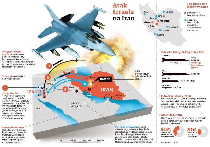 Pod kierunkiem ministra obrony Ehuda Baraka – jedynego obok Netanyahu człowieka, który będzie miał wpływ na decyzję o ataku na Iran – Izrael od lat przygotowuje się do zniszczenia tych ośrodków. Operacja zostanie przeprowadzona z powietrza przy użyciu większości spośród ok. 350 myśliwców F-16, F-18 oraz F-15 (porównywalnych sił powietrznych nie mają nawet tak duże kraje, jak Wielka Brytania czy Niemcy). Te maszyny nie są jednak w stanie udźwignąć bomb, które mogłyby przebić się przez kilkudziesięciometrową skorupę skał i betonu. Dlatego ich rola ma mieć raczej charakter przygotowawczy – zrzucone przez nie pociski mają spowodować wyłomy dla kolejnej fali uderzenia.