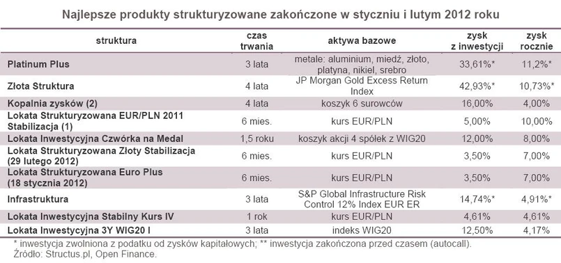 Zaledwie trzy z 67 zakończonych w styczniu i lutym inwestycji zakończyły się zyskiem na satysfakcjonującym poziomie, czyli przekroczyły 10 proc. w skali roku. Najwięcej zarobiły osoby, które ulokowały środki w opracowany przez Warta TUnŻ, a dostępny w Kredyt Banku produkt Platinum Plus. Była to trzyletnia struktura powiązany z koszykiem sześciu metali notowanych na giełdzie w Londynie (aluminium, miedź, nikiel, platyna, srebro i złoto). Stopa zwrotu z tej inwestycji wyniosła 33,61 proc. w trzy lata, czyli 11,2 proc. rocznie. Ale ze względu na formę polisy na życie i dożycie była ona zwolniona z podatku od zysków kapitałowych, czyli jej wynik można porównać z opodatkowanym 41,49 proc. (13,83 proc. rocznie).