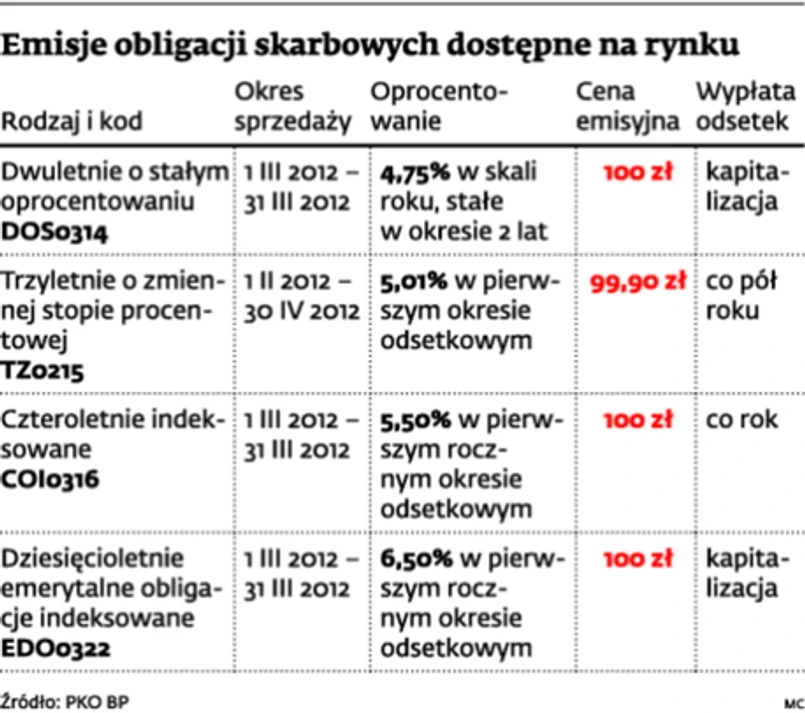 Oprocentowanie papierów trzyletnich w pierwszym roku wynosi 5,01 proc. Obligacje czteroletnie dadzą zarobić w pierwszym roku 5,55 proc. W kolejnych latach oprocentowanie będzie indeksowane o procent wynikający ze zmiany stopy inflacji. W marcowej ofercie MF są także papiery dziesięcioletnie (6,5 proc. zysku w pierwszym roku), które jednak ze względu na odległy termin wykupu mogą być polecane tylko bardzo dużym i stabilnym firmom.