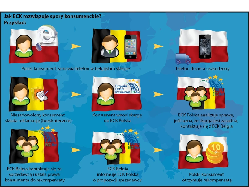 Zadaniem każdego z centrów obecnych w 29 krajach Europy (kraje Unii Europejskiej, Norwegia i Islandia) jest udzielanie porad oraz wsparcia w rozwiązaniu sporów z przedsiębiorcami, którzy pochodzą z innych krajów. Pomoc ECK jest nieodpłatna i polega na podjęciu interwencji u zagranicznego przedsiębiorcy w imieniu poszkodowanego konsumenta oraz próbie wypracowania satysfakcjonującego dla obu stron rozwiązania sporu. Dzięki temu, w wielu przypadkach, konsumenci otrzymują zwrot poniesionych kosztów, obniżkę ceny wadliwego towaru lub wymianę na nowy, a czasem także dodatkową rekompensatę finansową lub inne zadośćuczynienie, czytamy w materiałach prasowych ECK.