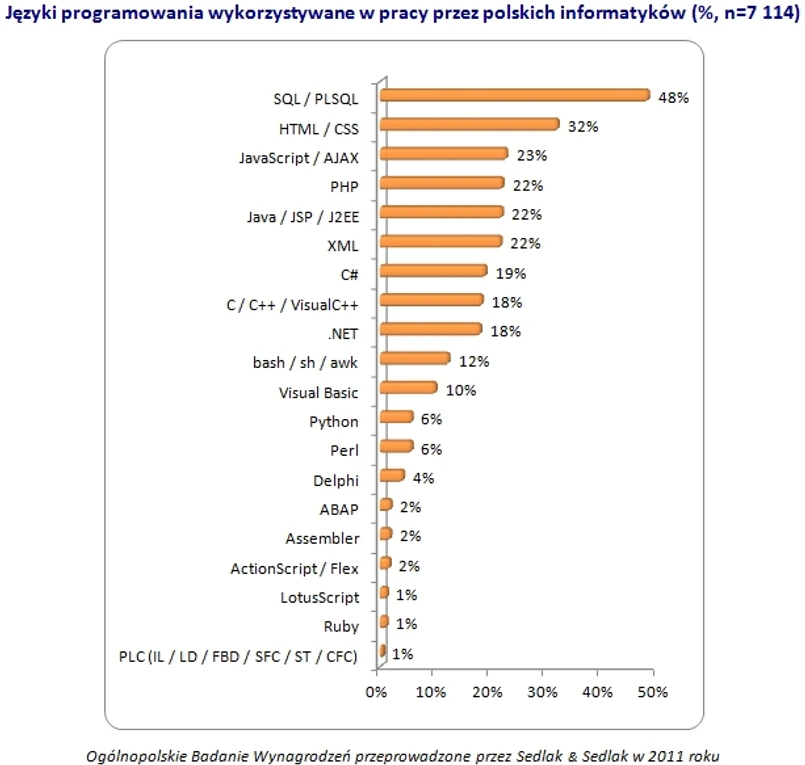 Umiejętność programowania w kilku językach to duży atut w negocjacjach z pracodawcami. Z Ogólnopolskiego Badania Wynagrodzeń przeprowadzonego przez Sedlak & Sedlak wynika, że w 2011 roku polscy informatycy programowali najczęściej w SQL/PLSQL. Ten język wykorzystywała niemal połowa informatyków, którzy wzięli udział w badaniu.