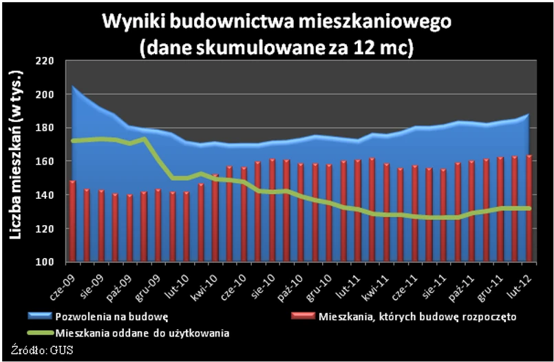 Spory wzrost widoczny jest także w obszarze liczby mieszkań, na realizację których wydano pozwolenia. Jest to miara o najbardziej prognostycznym charakterze z poruszanych przez GUS w dzisiejszej publikacji. Wydane pozwolenia nie muszą bowiem przełożyć się na faktycznie rozpoczęte budowy, a tym bardziej na powstanie nowych nieruchomości. Pozwoleń wydano w lutym o 31,5% więcej niż w analogicznym okresie rok wcześniej. W sumie było ich w drugim miesiącu 2012 roku 13,5 tysięcy. Największą w tej kategorii dynamikę wzrostu notują spółdzielnie. Otrzymały one w lutym 2012 roku pozwolenia na budowę prawie 12 razy większej liczby mieszkań. Niestety jest to jednak miara złudna, ponieważ w sztukach oznacza to jedynie 167 mieszkań, czyli może oznaczać zaledwie jedną inwestycję. Motorem napędowym w tej kategorii są deweloperzy. W lutym otrzymali oni pozwolenia na budowę 7,1 tys. mieszkań. Jest to wynik o 69,7% lepszy niż w analogicznym okresie przed rokiem. Rosnąca liczba mieszkań w budowie skłania deweloperów do coraz bardziej zaciekłej walki o klientów. Objawia się to nie tylko w spadających cenach nowych mieszkań, ale też coraz bardziej wyszukanymi promocjami (np. pokoje za darmo, alternatywne źródła finansowania czy sprzedaż mieszkań po obniżonych cenach w systemie grupowym).