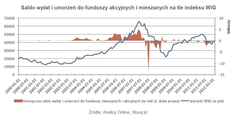 Wydaje się, że saldo wpłat i umorzeń do funduszy, zwłaszcza akcyjnych i mieszanych, czyli tych posiadających w portfelach akcje, powinno być ściśle powiązane z koniunkturą na giełdzie. I do pewnego stopnia tak jest, jednak nie do końca. Jeśli popatrzymy na rynek jako całość, czyli weźmiemy pod uwagę wszystkie typy funduszy, także takie, które w akcje w ogóle nie inwestują, to wyraźne widać związek pomiędzy koniunkturą giełdową a napływem nowych środków (wykres powyżej). Ale już porównując zachowanie indeksu WIG oraz saldo wpłat i umorzeń wyłącznie dla funduszy akcji i mieszanych (wykres poniżej), można dojść do wniosku, że jednak nie zawsze tak bywa, choć mogłoby się zdawać, że właśnie w przypadku funduszy zaangażowanych w akcje ta zależność powinna być szczególnie widoczna. Zwraca uwagę przede wszystkim okres od początku 2009 roku, w którym pomimo generalnej tendencji wzrostowej na rynku akcji, zainteresowanie nimi wśród klientów było raczej niewielkie.