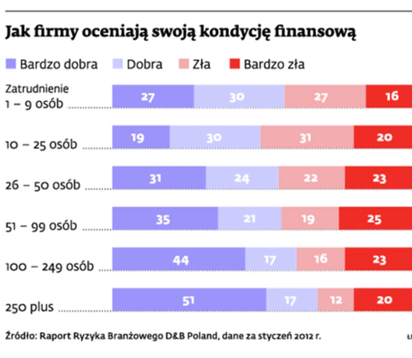 Rachunki to zmora małych firm. Wystarczy, że wzrosną o kilkanaście procent, by miało to negatywne przełożenie na płynność mikroprzedsiębiorstwa. W czasie spowolnienia gospodarczego, gdy ceny ropy, energii, gazu rosną, a popyt na produkty i usługi maleje, ciężar rachunków stał się jeszcze większy. Zwłaszcza że sytuacja małych firm nie jest najlepsza. Najgorzej radzą sobie firmy zatrudniające od 10 do 25 osób. Wśród takich, jak wynika z raportu ryzyka branżowego D&B Poland, swoją kondycję finansową ponad połowa przedsiębiorców ocenia jako słabą i złą.