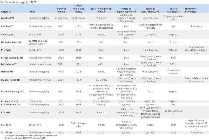 Dwie instytucje nie pobierają opłat za zarządzanie IKZE: PKO BP Bankowy PTE i Deutsche Bank. Warto pamiętać, że jeśli będziemy chcieli po roku wycofać pieniądze z IKZE, w niemal wszystkich instytucjach zapłacimy opłatę karną, w niektórych przypadkach bardzo dotkliwą, bo sięgającą połowy wypłacanych środków (Aviva Życie, ING Życie, PKO BP Bankowy PTE). Tego rodzaju pułapki na klientów nie zastawia Kredyt Bank. Niektóre instytucje oferują dodatkowe usługi. Na przykład ING Życie będzie co roku dokonywało indeksacji składki o 3 proc., chyba że klient co najmniej na 15 dni przed rocznicą polisy zażyczy sobie, by towarzystwo tego nie robiło.