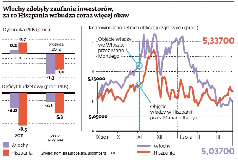 – Nie potrzeba wiele, aby znowu pojawiło się ryzyko destabilizacji całej strefy euro. O ile Mariano Rajoy zasługuje na pochwałę z powodu reformy rynku pracy, to finansom publicznym nie poświęcił on wystarczająco dużo uwagi – ostrzegł wczoraj Mario Monti. Trudno o większą zmianę z ciągu zaledwie pięciu miesięcy. Gdy Monti obejmował w listopadzie władzę, to Włochy były uważane za epicentrum kryzysu, co znajdowało odzwierciedlenie w bardzo wysokiej (ponad 7-proc.) rentowności 10-letnich obligacji tego kraju.