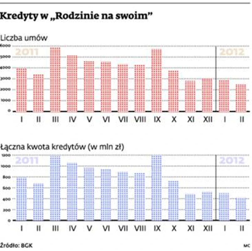 O ile w styczniu wartość nowych kredytów udzielonych w ramach „Rodziny na swoim” trzymała się blisko 0,5 mld zł, luty wypadł już znacznie gorzej. Wartość nowych pożyczek była w porównaniu ze styczniem o ponad 15 proc. niższa i wyniosła 421,6 mln zł. W ubiegłym roku średnia wartość nowych kredytów w ramach RnS wynosiła 854,2 mln zł miesięcznie.