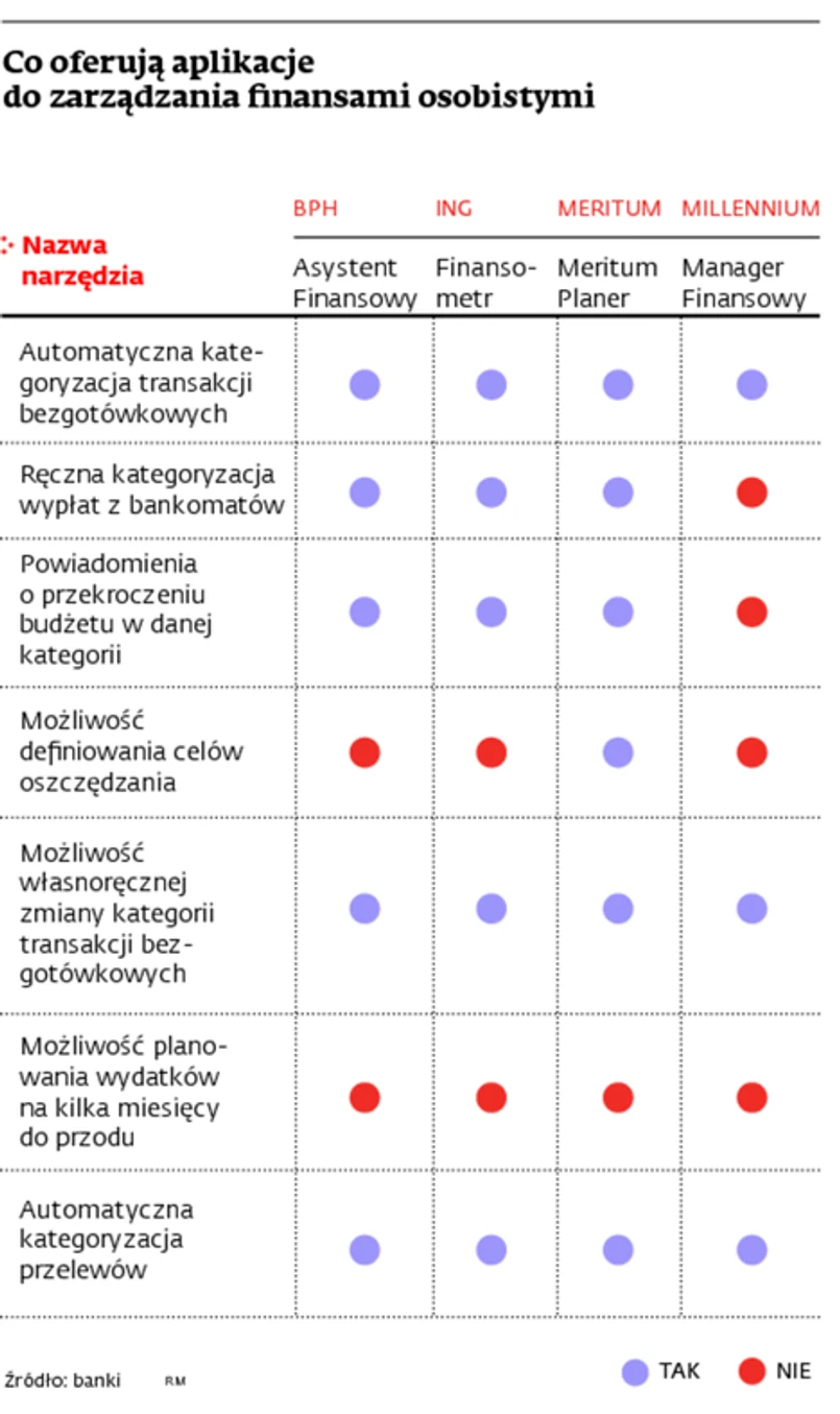 Aplikacja Millennium jest też uboższa od konkurencji o powiadomienia na wypadek przekroczenia budżetu danej kategorii w miesiącu. W przypadku rozwiązań dostępnych w pozostałych trzech instytucjach klient dostanie np. e-mailem powiadomienie, że wydatki w którejś kategorii przekroczyły zaplanowaną na ten miesiąc sumę. Rozwiązanie Millennium ma też zostać wkrótce rozbudowane o możliwość definiowania celów oszczędzania. Obecnie taką możliwość ma jedynie Planer Finansowy w Meritum Banku. Wszystkie instytucje zapowiadają także, że w najbliższym czasie zwiększą możliwości swoich narzędzi o budżetowanie na kilka miesięcy naprzód, dzięki czemu będzie można z odpowiednim wyprzedzeniem zaplanować na przykład zwiększone wydatki na energię w okresie zimowym czy dodatkowe przychody ze zwrotu podatkowego wiosną. Bankowcy nie mają wątpliwości, że wkrótce aplikacje PFM w polskich bankach umożliwią zarządzanie zadłużeniem czy inwestycjami i oszczędnościami. – Można także spodziewać się wersji na smartfony – mówi Krzysztof Łęgowski z BPH.