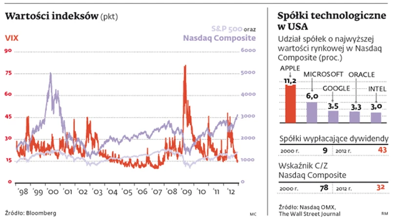 Liczby wskazują, że obecnie wyceny spółek IT są bardziej racjonalne niż w latach 1999 – 2000. Wskaźnik cena do zysku Nasdaq Composite wynosi 23, podczas gdy 12 lat temu sięgał nawet 78. – Inwestorzy przez dekadę nie interesowali się tymi firmami. Mowa nie tylko o Apple’u, lecz także o takich gigantach, jak IBM, Microsoft czy Intel. Teraz zainteresowanie nimi odżyło. Na wykresach doszło do wybić z długoterminowych konsolidacji. Powstały więc silne i długotrwałe sygnały kupna – zapewnia analityk DM BOŚ.