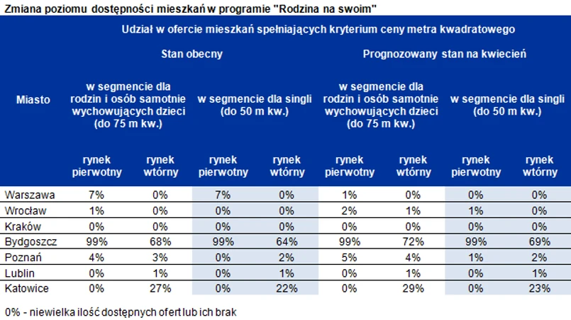 Na tym tle dostępność mieszkań w programie „Rodzina na swoim” w takich miastach jak Bydgoszcz czy Katowice można uznać za bardzo wysoki. W pierwszym z nich przeważająca większość mieszkań, jest obecnie oferowana przez właścicieli za cenę, która pozwoli na ich zakup z preferencyjnym kredytem – o ile spełniają inne wymagania programu (np. wiek kredytobiorcy, powierzchnia nieruchomości). W Katowicach do dopłat kwalifikują się głównie mieszkania używane. Od kwietnia będzie ich tylko trochę więcej – w segmencie dla singli 23% ofert mieszkań o powierzchni do 50 m kw., a w segmencie dla rodzin i osób samotnie wychowujących dzieci 29% mieszkań o powierzchni do 75 m kw.