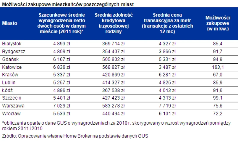 Nieco inaczej sytuacja wygląda w takich miastach, jak Kraków, Warszawa czy Wrocław. Tam modelowa rodzina mogłaby pozwolić sobie na zakup ponad dwukrotnie mniejszej nieruchomości niż w Katowicach. Jest to odpowiednio 67, 76 i 72 m kw., co zazwyczaj odpowiada mieszkaniu trzypokojowemu. Powody dysproporcji pomiędzy miastami o największych i najmniejszych możliwościach zakupowych są dwa. Po pierwsze ceny mieszkań, które w Krakowie i Wrocławiu przekraczają 6 tys. zł za m kw., a w Warszawie 7,7 tys. Z drugiej strony winić można poziom wynagrodzeń, choć ten zgodnie ze statystykami GUS raczej jest nienaturalnie wysoki w Katowicach niż za niski w Warszawie. Warto bowiem zauważyć, że przeciętna katowicka rodzina, w której dwie osoby pracują dysponowałaby dochodem zaledwie o 200 zł niższym niż warszawska. Należy też zwrócić uwagę na warunkujące zdolność kredytową dochody w Krakowie. W stolicy Małopolski są one pomiędzy poziomem lubelskim i szczecińskim. Dla porównania, we wspomnianych miastach ceny nieruchomości są o jedną trzecią niższe niż w Krakowie.
