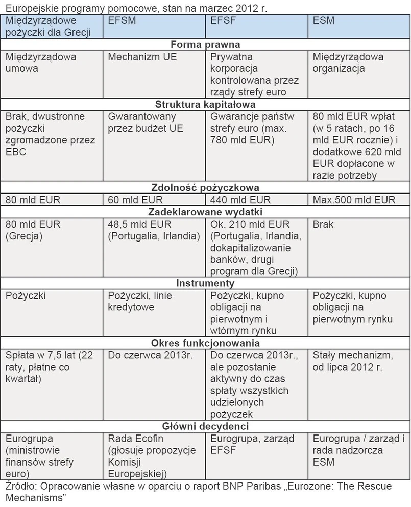 4. ESM (European Stability Mechanisms) – pierwszy mechanizm pomocowy działający nie jako tymczasowy wehikuł, lecz trwałe rozwiązanie, wystartuje w drugiej połowie 2012 r. Jego konstrukcja znacznie różni się od poprzednich inicjatyw ratunkowych – najważniejszą różnicą jest zasilenie mechanizmu żywą gotówką, w przeciwieństwie do dotychczasowych gwarancji i poręczeń. W perspektywie 5 lat, gdy wpłacone zostanie 80 mld EUR kapitału, jego moc pożyczkowa może sięgnąć maksymalnie 500 mld EUR. Z technicznego punktu widzenia ESM będzie przypominał quasi-bank dysponujący własnym kapitałem, tyle że nie podlegającym pod nowe surowsze wymogi kapitałowe, którym za kilka miesięcy będą musiały stawić europejskie instytucje finansowe.