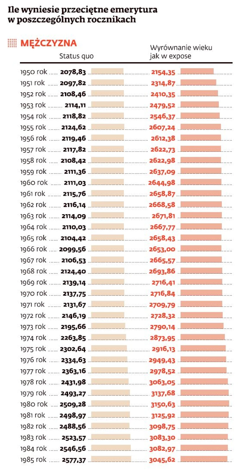 Niższa kwota to wariant dla osoby pracującej zgodnie z obecnym prawem do 60. roku życia. Dla mężczyzn różnice są mniejsze, bo ich wiek jest wydłużany o dwa lata, ale i tak są znaczne – 2864 zł zamiast 2262 zł przy wieku emerytalnym 65 lat.