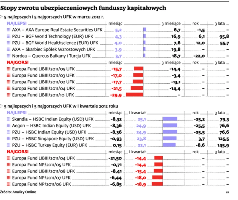 Zarówno marca, jak i całego I kwartału nie zaliczą do udanych posiadacze polis z UFK powiązanych z rynkiem surowców. Szczególnie słabe wyniki osiągnęły polisy z funduszami mającymi ekspozycję na złoto – potraciły w skali kwartału po kilkanaście procent. Jednak na szarym końcu zestawienia miesięcznego i kwartalnego znajdują się produkty spod szyldu Europa Fund oferowane przez Towarzystwo Ubezpieczeń Europa, powiązane z zagranicznymi funduszami ochrony kapitału. Najgorszy z nich w I kwartale stracił blisko 19 proc.