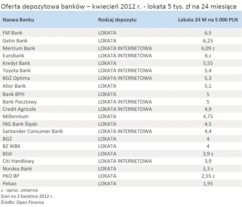 Jeśli zechcemy założyć lokatę na dwa razy dłuższy okres, czyli na rok, najlepiej, jeśli powierzymy swoje pieniądze Deutsche Bankowi, bankowi Nordea i FM Bankowi. Z zestawienia przygotowanego przez Open Finance, przy lokacie wysokości 5000 zł na 24 miesiące, w rankingu wygrywa FM Bank. Zaraz za nim uplasowały się Genin Bank i Meritum Bank.